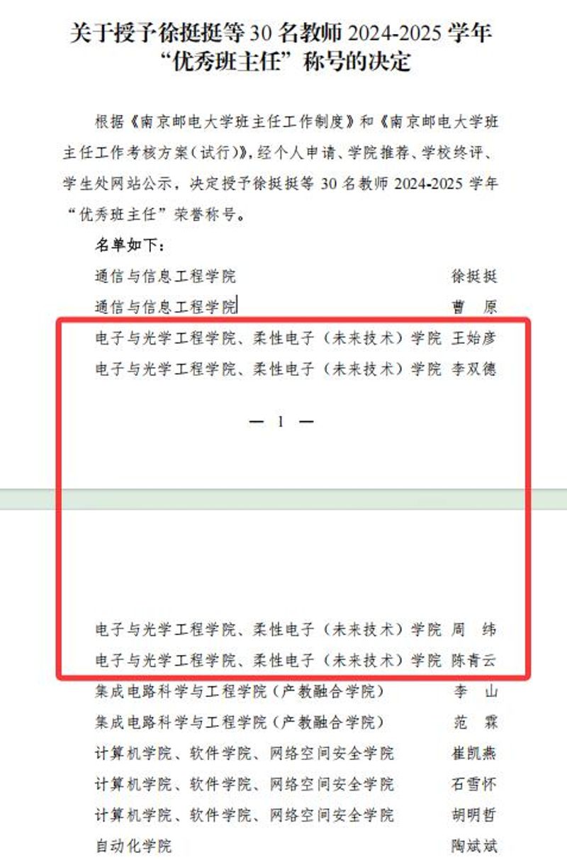 近日,南京郵電大學(xué)2024-2025學(xué)年“優(yōu)秀班主任”評(píng)選結(jié)果正式揭曉。全校共30位教師獲此殊榮,其中,電子與光學(xué)工程學(xué)院、柔性電子(未來(lái)技術(shù))學(xué)院共有四位教師光榮入選,分別是王始彥、李雙德、周緯、陳青云。本次評(píng)選注重學(xué)生的真實(shí)反饋,根據(jù)“學(xué)生評(píng)價(jià)情況”(即班主任工作測(cè)評(píng)分?jǐn)?shù))和班主任提交的各類(lèi)履職材料,對(duì)各位班主任老師的履職情況進(jìn)行綜合評(píng)定,最終擇優(yōu)入選。電光柔院此次能夠有四位教師脫穎而出,榮獲校級(jí)“優(yōu)秀班主任”稱(chēng)號(hào),是學(xué)校對(duì)學(xué)院班主任工作整體水平和育人實(shí)效的高度認(rèn)可。入選老師在日常工作中,始終堅(jiān)守育人初心,恪盡職守,在思想引領(lǐng)、學(xué)業(yè)指導(dǎo)、生涯規(guī)劃、班級(jí)管理等方面傾注了大量心力,贏得了學(xué)生一致好評(píng)。此次優(yōu)異成績(jī)的取得是學(xué)院長(zhǎng)期以來(lái)堅(jiān)持立德樹(shù)人根本任務(wù)、不斷加強(qiáng)和改進(jìn)班主任工作的成果體現(xiàn)。電光柔院將以此為契機(jī),持續(xù)深化班主任隊(duì)伍建設(shè),充分發(fā)揮優(yōu)秀班主任的示范引領(lǐng)作用,不斷探索學(xué)生工作的新思路、新方法,努力提升人才培養(yǎng)質(zhì)量,為學(xué)生的全面成長(zhǎng)成才和學(xué)校的高質(zhì)量發(fā)展做出更大貢獻(xiàn)。撰稿:祝騰審核:徐磊編輯:祝騰